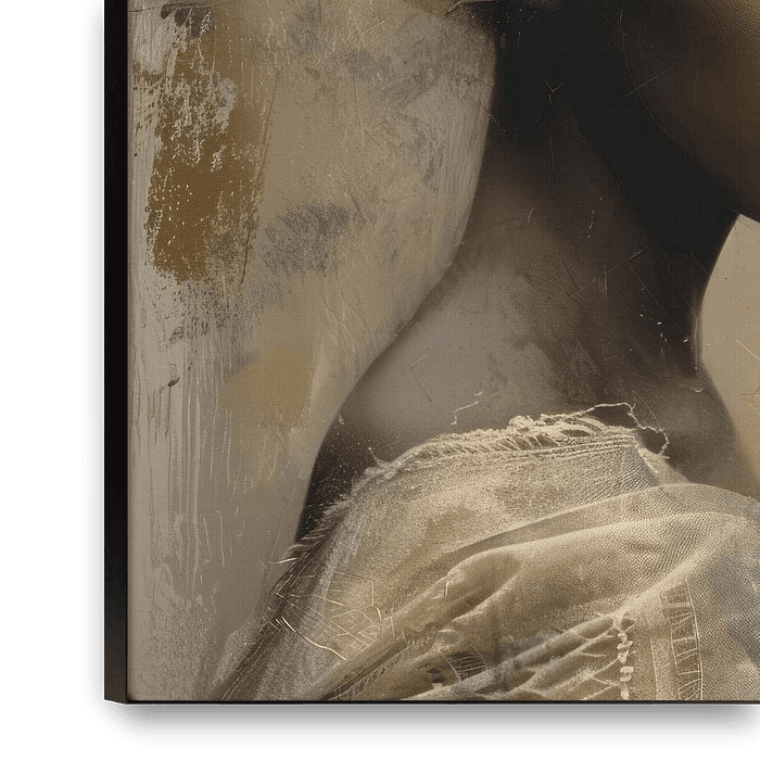 Portret van een Afrikaanse vrouw, modern en deels abstract. In aardetinten en goud. Modern chic. Kies zelf het formaat en materiaal en maak er een echte blikvanger van voor jouw interieur.