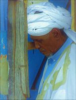 The Gambia / Land / Afrika / Man / Kleermaker / Markt / Kleding / Blauw / Wit / Bruin / Fotografie / Sfeer / Licht / Schaduw /