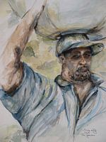 Als men op het land werkt in Gambia om de rijst te oogsten wordt de lunch gebracht en eet men gezamenlijk. De lunch wordt gekookt door de vrouwen die thuis blijven . Aquarel van één van de mannen met de lunchschaal op zijn hoofd.
