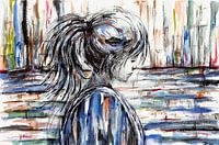 Handgeschilderde aquarel van een triest eenzaam meisje. Zij staat achter een muur voor haar stad die zij niet kan bereiken vanwege een oorlog of conflicten.