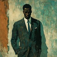 In het hart van dit fascinerende schilderij staat een man met een bruine huidskleur en een onwankelbare aanwezigheid, zijn maatpak omarmt zijn gestalte moeiteloos. Het pak, perfect gesneden en op maat gemaakt, getuigt van nauwgezette aandacht voor detail, terwijl de stof een stille luxe uitstraalt. Tegen een achtergrond geschilderd in…