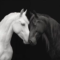 Close portret van twee paarden, een zwart en een wit paard. De hoofden liefdevol dicht bij elkaar.