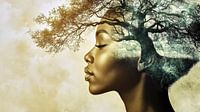 Kunstzinnige illustratie van het profiel van een vrouw met een boom boven haar hoofd. Deze afbeelding symboliseert vrede, rust en de diepe band tussen mens en natuur.