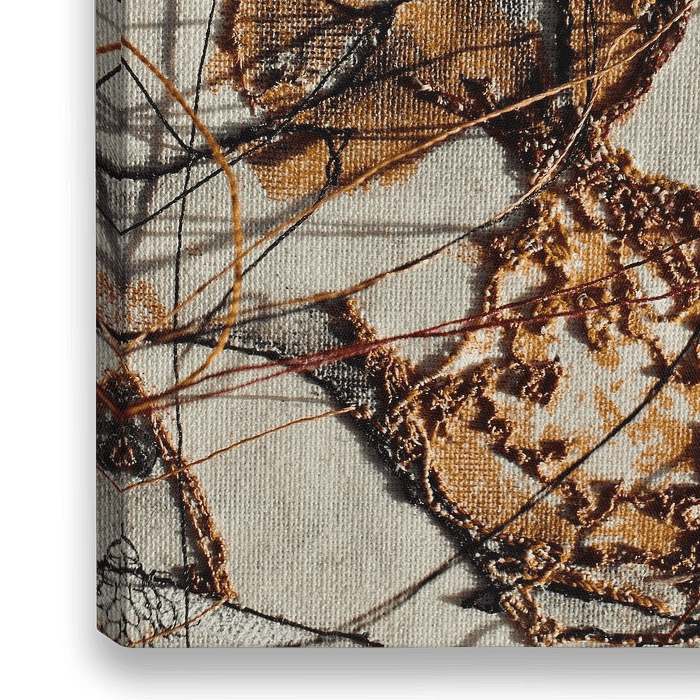 Een figuratief abstract geborduurd werk van draad & acryl op doek.
