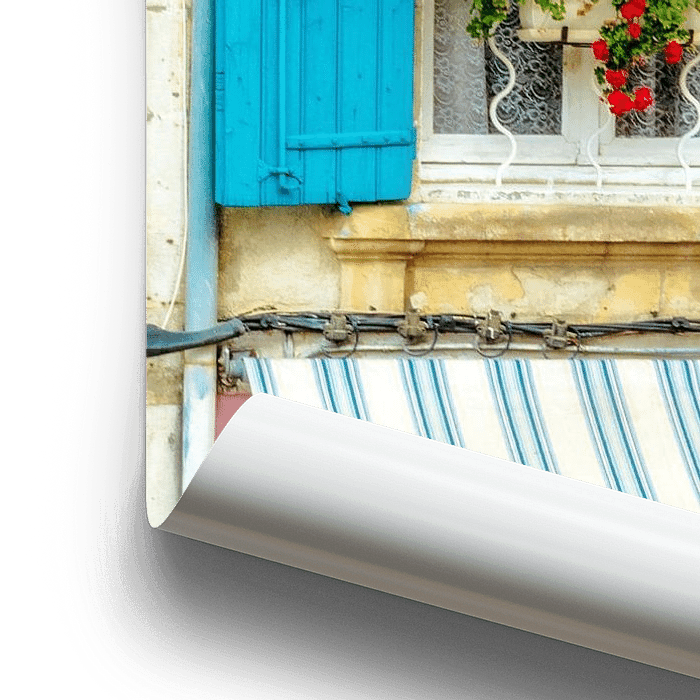 Typische Franse Provençaalse stijl ramen met blauwe luiken en bloembakken. Ook de zonwering en de kleur van de muur is heel herkenbaar voor de Provence.