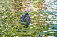 Nee, het zijn geen gekleurde lampen die het water van de Leidse Singel in een psychedelische gloed zetten. Het zijn de reflecties van het blauw van de lucht, het groen van de bomen en de rode romp van een woonboot die de omgeving van deze eend kleur geven.