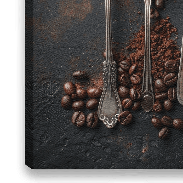 Dit prachtige kunstwerk toont drie antieke lepels die zorgvuldig koffiebonen en versgemalen koffiepoeder presenteren. De donkere, rustieke achtergrond accentueert de texturen en kleuren van de bonen en het poeder. Perfect voor koffieliefhebbers en keukens die op zoek zijn naar een vleugje vintage flair.