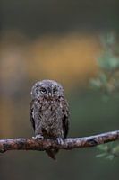 Pygmeeëneeuwuil ( Otus scops ) zit op de tak van een dennenboom voor een prachtige achtergrond, Europa.