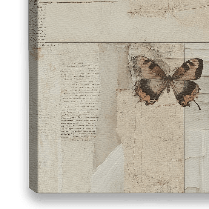 Dit kunstwerk toont een subtiel en ingetogen portret van een vrouw omgeven door vlinders en fragmenten van papier. Haar gezicht is gedeeltelijk verborgen achter vintage lijkende tekst, wat een gevoel van mysterie en zachtheid oproept. De combinatie van vlinders en de vervaagde, gescheurde papierlagen symboliseert vergankelijkheid en de…