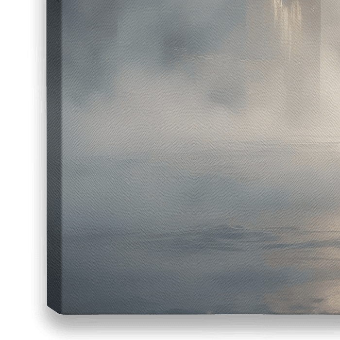 Goud en zacht blauw lossen op in een uitgestrekte, mistige ruimte waarin grenzen vervagen. Verticale lichtsluiers stijgen op uit een dampige ondergrond, terwijl warme reflecties subtiel door nevel en schaduw heen breken. Er is geen centraal object, geen…