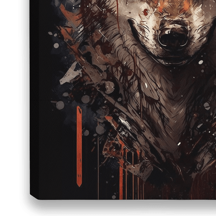 "Raging Spirit" is een kunstwerk dat de ontembare kracht van de natuur en de wilde geest van de wolf vastlegt. De wolf kijkt recht in de camera en lijkt boos, omringd door rood-oranje verfspetters die de vurige intensiteit van zijn emoties weerspiegelen. De witte stippen en de zwarte achtergrond creëren een gevoel van sneeuw…