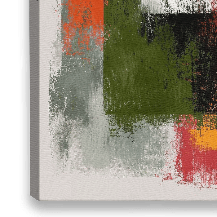 Een abstract schilderij met krachtige, gestructureerde penseelstreken, rechthoekige kleurvlakken overlappen elkaar waardoor een dynamische compositie ontstaat. De algehele indruk is er een van abstract expressionisme met rauwe energie en levendig contrast.