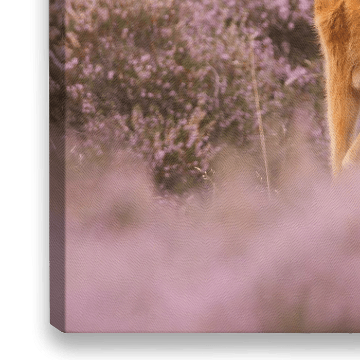 Een reebok staat tussen de prachtig paars bloeiende heide