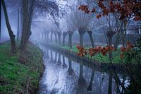 De mist geeft ineens een hele andere sfeer aan een laantje waar je regelmatig overheen rijdt. Dichtbij is de sloot met reflectie van de knotwilgen nog goed te zien. Na de lange bomenrij langs de sloot en de laan is de wereld wit.