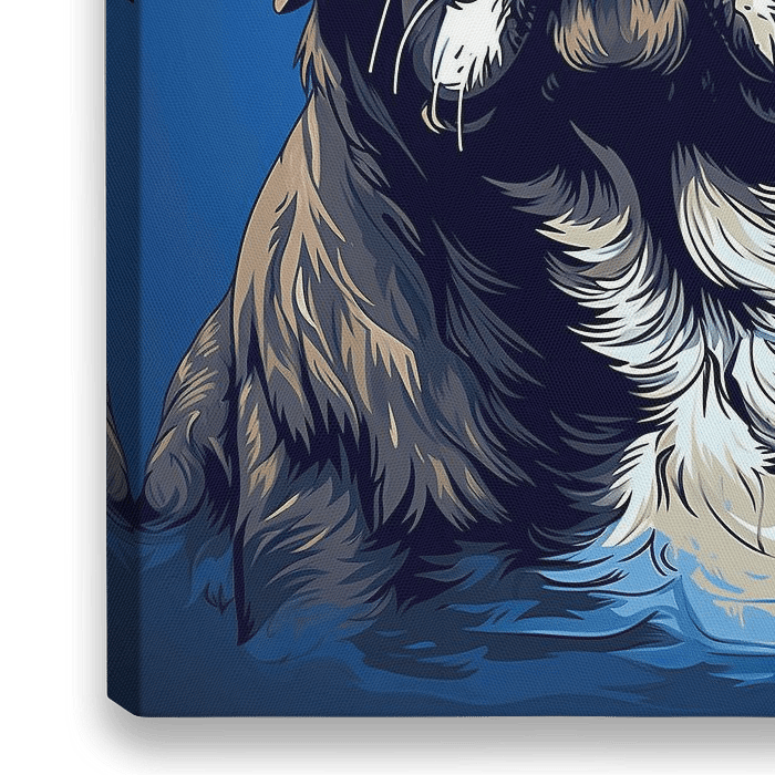 Reflectie - Op het doek staat een portret van een hond met een zonnebril, die een reflectie van bergtoppen toont. De tekenstijl is grafisch met cleane lijnen en sterke kleurcontrasten.