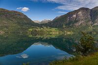 Dit is het meer Oppstrynsvatnet, wat op een mooie zomermiddag prachtig stil was en mooie reflecties boodt.