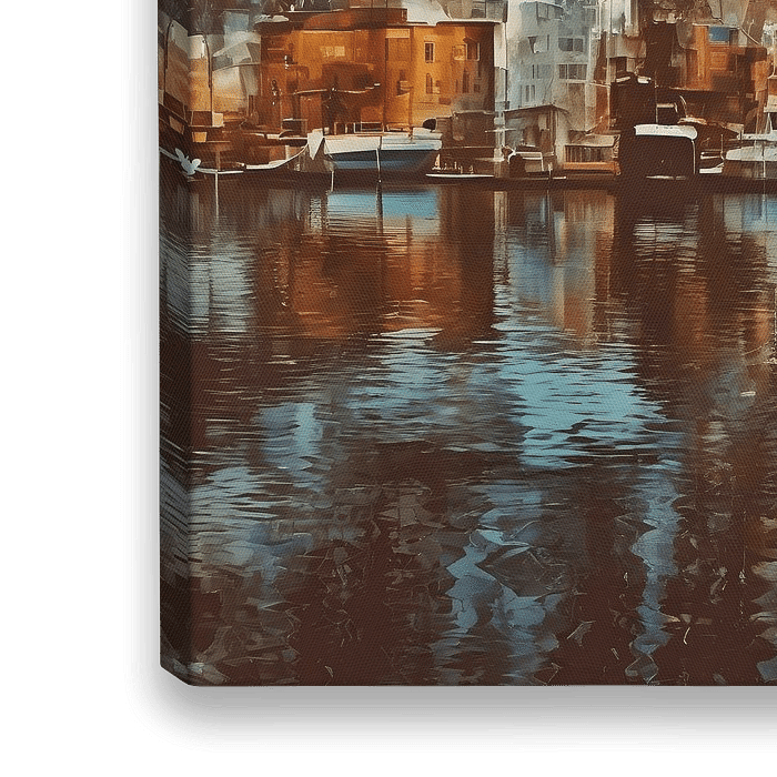 Dit schilderachtige kunstwerk vangt de essentie van een bruisende havenstad in een abstracte, bijna dromerige stijl. De compositie is opgebouwd uit een gelaagd spel van kleuren en texturen, waar warme aardetinten zich vermengen met koele blauwen en grijstonen.