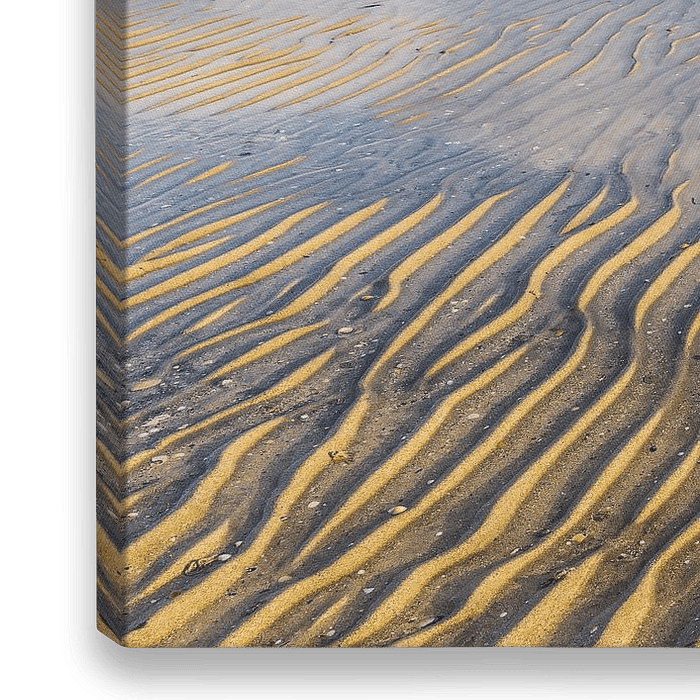 Prachtige zandstructuren in een heel dun laagje water met daarin de refelcties van een berg. Foto is genomen op de Lofoten, Noorwegen