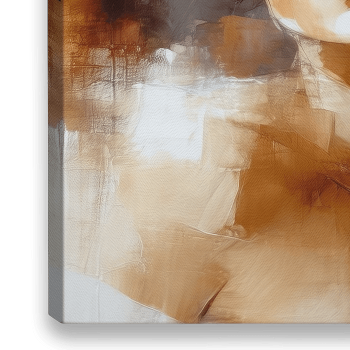 Reflectieve Terracotta - Dit is een vrouwenschilderij waarin een vrouw met een introspectieve blik, omgeven door een levendig palet van overwegend terracotta en bruine tinten die subtiel overlopen in witte en zwarte accenten, artistiek weergegeven wordt op een abstracte manier met vloeibare en dynamische penseelstreken.
