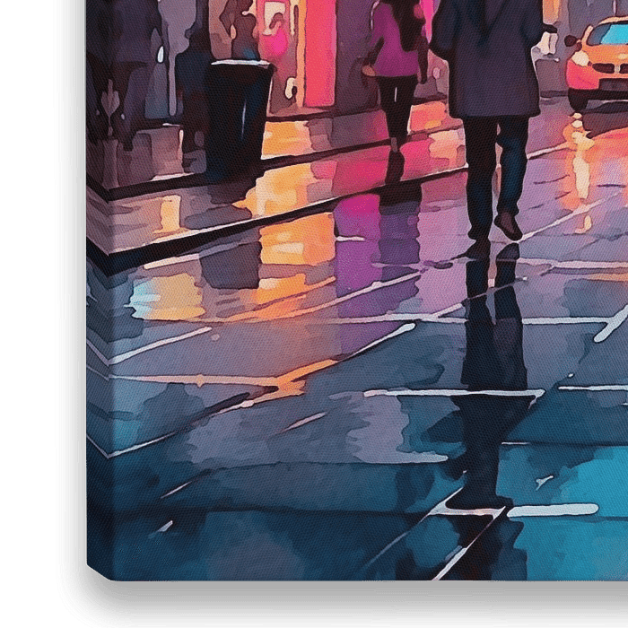 De regen vertroebelt de stadslichten. De duisternis wordt gebroken door de kleurreflecties van de neonlichten.