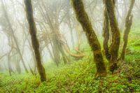 Laurier regenwoud op het eiland La Gomera. De foto toont grillig gevormde Laurier bomen in het mistige regenwoud. De bomen zijn bedekt met groen mos. Er hangt een geheimzinnige sfeer.