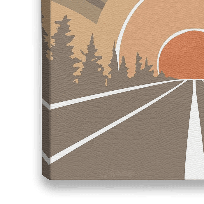 Abstract landschap met aan weerszijden een weg met bomen, recht de ondergaande zon in. Het sunburst-ontwerp en de kleuren (vervaagde tinten bruin en oranje plus wit) zijn een eerbetoon aan retro-posters uit het midden van de eeuw en de schoonheid van de herfst.