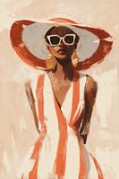 Een fashion portret in warme terracotta en beige tinten, uitgevoerd als schilderkunst. De elegante compositie toont een zomerse look met een opvallende witte jurk, statement zonnebril en een dramatische grote hoed. De gouden oorbellen en gestikte lippen geven het geheel een tijdloze, glamoureuze uitstraling die doet denken aan de haute…