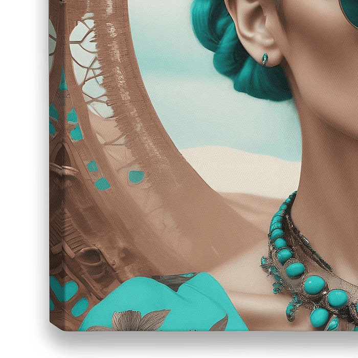Een portret van een vrouw met bloemen in haar haar en een zonnebril op. In turquoise kleuren met een retro look.