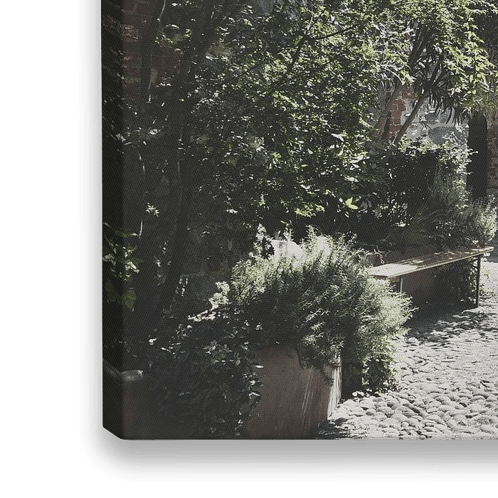 De levendige kleuren van Ricetto di Candelo bij Biella in Italië vangen de essentie van historische charme. Zonlicht verlicht zachtjes een schilderachtige, geplaveide binnenplaats omringd door rustieke, historische stenen gebouwen. Een weelderige boom voegt groen en contrast toe aan de aardetinten van de architectuur. Reisfotografie,…