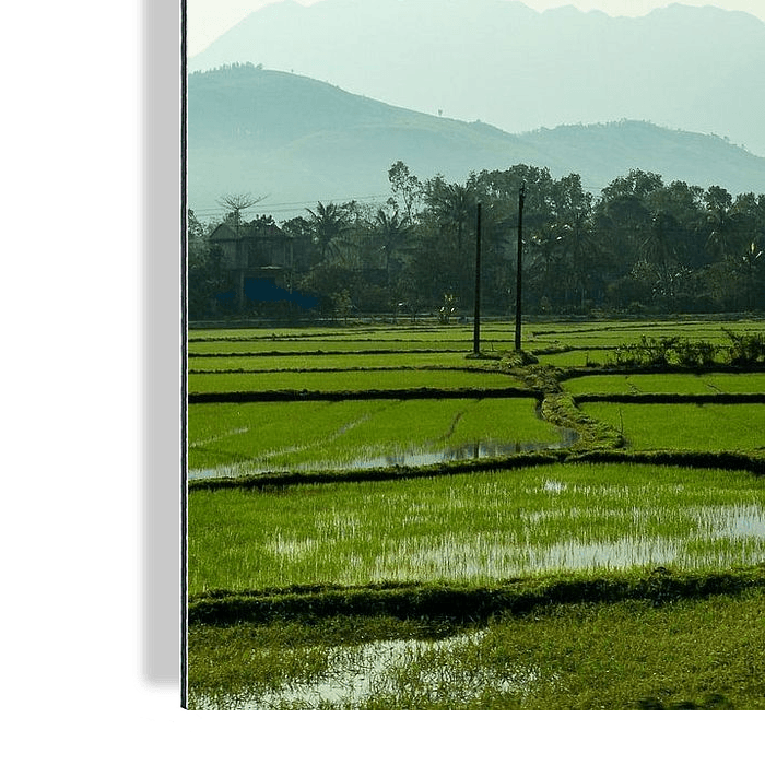 Rijstvelden tussen de Vietnamese heuvels. De opkomende zon geeft een mooi zacht licht over het landschap.