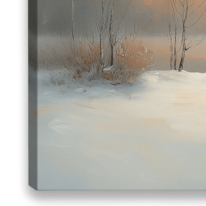 Rode Boom | Rode Boom Sneeuw - Dit is een landschap schilderij en kerst schilderij waarin een besneeuwd voorland met voetsporen naar een spiegelend meer ligt en rechts een opvallende rode boom met scharlaken bladeren het centrum vormt, alles in een zachte moderne impressionistische stijl verlicht door een warme oranje zonsondergang —…