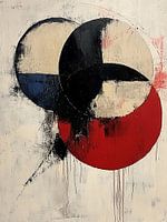 Rode Cirkel | Abstracte Kleurenspel - Dit abstract schilderij kenmerkt zich door vier overlappende cirkels in zwart, blauw, beige en rood op een verweerde witte achtergrond, wat een gevoel voor dynamiek en beweging creëert.