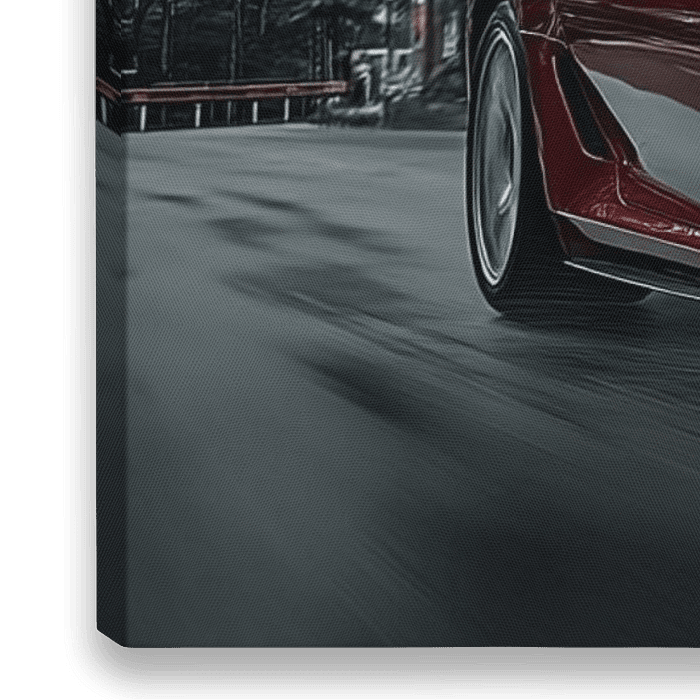 Een rode Ferrari 559 uit 2024 rijdt vol gas, gefotografeerd in volledige zijwaartse pose. Hyperrealistische details, een mix van symmetrie en asymmetrie, gestroomlijnd design. De achtergrond is zwart-wit, voor een tijdloze sfeer. Gefotografeerd op Fujifilm Eterna 400T type 8673, met een filmlook die de kracht en elegantie van de auto…