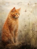 Deze afbeelding toont een prachtige rode kat die stil zit te midden van een weide met dorre grassen en uitgebloeide bloemen. De kat straalt een rustige alertheid uit, terwijl hij in de verte lijkt te staren. Zijn vacht, met warme oranjerode tinten, contrasteert mooi met de zachte en vervagende kleuren van de achtergrond. De gedroogde…