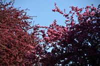 De twee bomen staan tegenover elkaar in de straat in de stad. Van de ene boom is de bloesem al geopend, van de andere nog in de knop. De schaduw viel juist weer meer over de eerste boom. Voor een paar takken van die boom was het licht al wel aan. Dit gaf wel een mooie kleurschakering zo ten opzichte van de blauwe lucht .