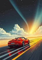 Over ‘Rode Porsche 718 Spyder - Snelheid op heldere weg, wolken, felle zon en sterrenhemel’ van MIROKKU
