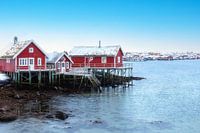 De rode vakantiehuizen, ook wel Rorbuer genoemd, liggen in het dorpje Reine op de Lofoten in het uiterste noorden van Noorwegen.