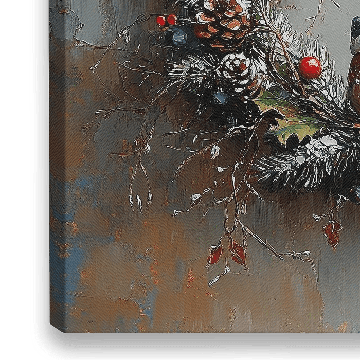 Rode Strik - Dit is een krans schilderij, een schilderij krans van een moderne kerstkrans met een grote rode strik in het midden, omringd door dennenappels, hulstbladeren en rode en blauwe bessen met een klein vogelornament, geschilderd in dikke verf en een impressionistische, moderne stijl met sneeuwaccenten.