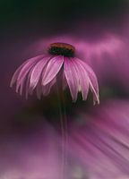 Rode zonnehoed in eigen tuin. In de avond gefotografeerd met een zacht schijnsel van een lamp op de roze/paarse bloemblaadjes. Dubbele belichting maakt de foto zijdezacht.