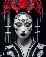 Het portret straalt een fascinerende symbiose uit van traditie en moderniteit, waarin elementen van de geishacultuur samenkomen met een futuristische esthetiek. De koele, bijna bovennatuurlijke bleekheid van het gezicht wordt gecontrasteerd door zwarte en rode accenten die de intensiteit van de uitdrukking benadrukken. Het gezicht van…