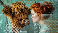 Een schotse hooglander en een roodharige jonge vrouw, oog in oog met elkaar. Digitaal kunstwerk gemaakt met hulp van AI en verder bewerkt in photoshop met diverse lagen, texturen en patronen.