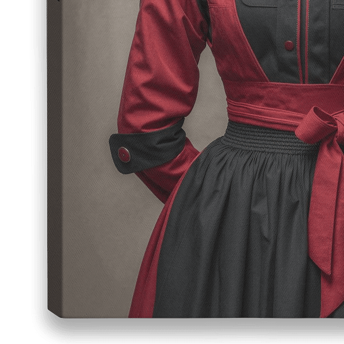 Deze foto leeft van reductie en contrast. De figuur staat frontaal, rechtop en volledig stil. Niets aan haar houding is uitnodigend, niets is afschrikwekkend. Ze is er gewoon. De blik lijkt neutraal, bijna emotieloos, en dat is precies wat haar een sterke aanwezigheid geeft. Het zwarte oppervlak van het gezicht absorbeert het licht…