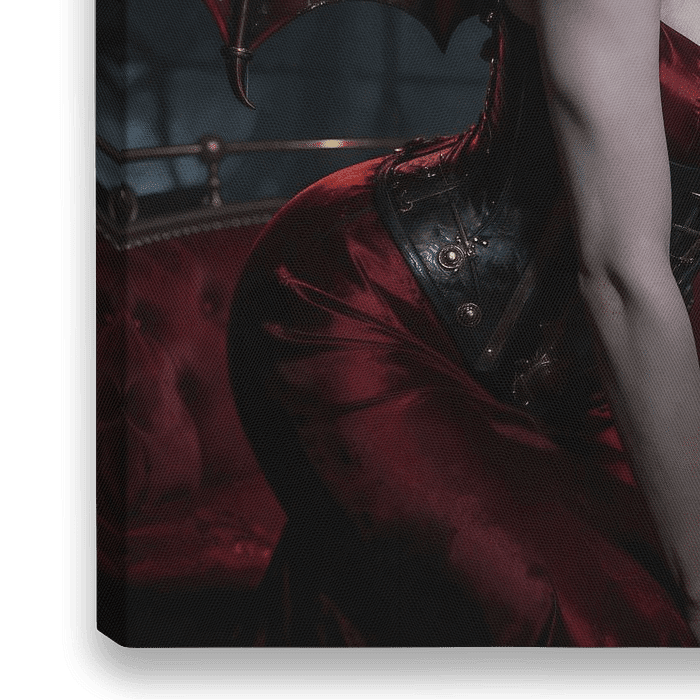 Dit schilderij ensceneert een figuur tussen verleiding en bedreiging, tussen controle en toewijding. Het dominante rood is hier niet zomaar een kleur, maar een houding: sensueel, agressief, onmiskenbaar. Het doordringt de stof, het licht en de blik als een innerlijke puls die de ruimte oplaadt.
