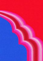 Een rode en blauwe achtergrond met roze strepen en een grote, gebogen boog in het midden van de afbeelding. Korrelige textuur, minimalistische pop-artstijl met felle kleuren. Symmetrische compositie, gecentreerd, met verzadigde kleurvlakken. Lage hoek, duidelijke lijnen en gedurfde vormen creëren een modern, decoratief en opvallend…