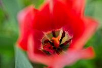 Red Tulip Macro - een rode tulp abstractie die focust op het midden van de meeldraden van een rode tulp. De rode bloemblaadjes van de tulp contrasteren met het zachte groen van het gebladerte. Slechts een fractie van de binnenkant van de tulp is scherpgesteld en nodigt uit tot verkennen.