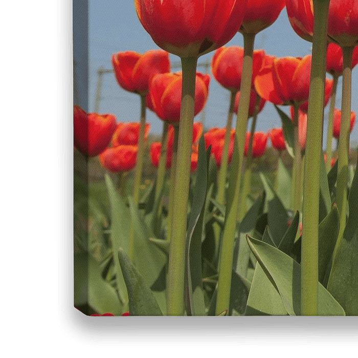 Rood bloeiende tulpen tegen een achetrgrond van een helder blauwe lucht