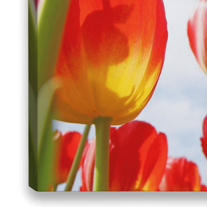 Rode tulpen met blauwe lucht. De tulpen en de bollenvelden geven ieder voorjaar weer de prachtige kleuren en vrolijkheid weer
