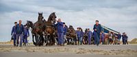 Demonstratie lancering van de roeireddingboot Secretaris Schumacher door de Stichting Museumreddingboot op het Waddeneiland Terschelling met behulp van vrijwilligers, tien Friese paarden, tien roeiers en een stuurman.