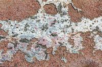 Metalen plaat ter afdekking van een put is verweert door het weer. Er zit nog maar een sprankje verf. Zachte tinten van roest komen omhoog.