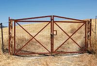 Koop dit landschapskunstwerk Roestige poort bij een opgedroogd veld van Frank Herrmann op canvas, aluminium dibond, (ingelijste) fotoprint, behang en ArtFrame, op maat geprint in Fine-Art kwaliteit.